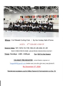Program starts Dec 7 at 3:00 pm – parents must accompany curlers for payment and final registration